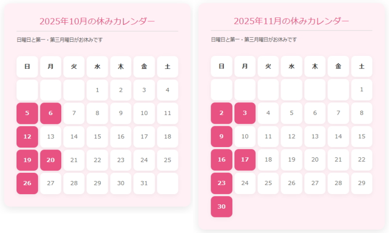 Q10. 受付時間や定休日はいつですか? 当院の受付時間は午前9:00〜午後8:00です。定休日は日曜日と第1・第3月曜日となっております。なお、受付時間内にご予約いただければ、施術は最大で午後10:30ころまで行っておりますので、お仕事帰りなどでも安心してご利用いただけます。